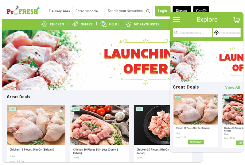 Profresh is an online meat ordering and delivery app which delivers a wide variety of meat products. Customers can search for their preferred variety of meat through various filters and get the fresh meat delivered directly to their doorsteps at affordable prices.
